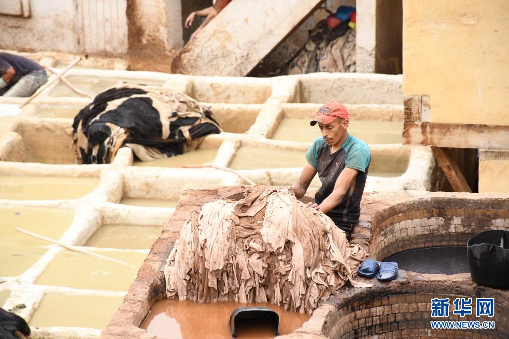 5月30日,工人正在摩洛哥非斯古城內(nèi)的皮革染坊中勞作。
