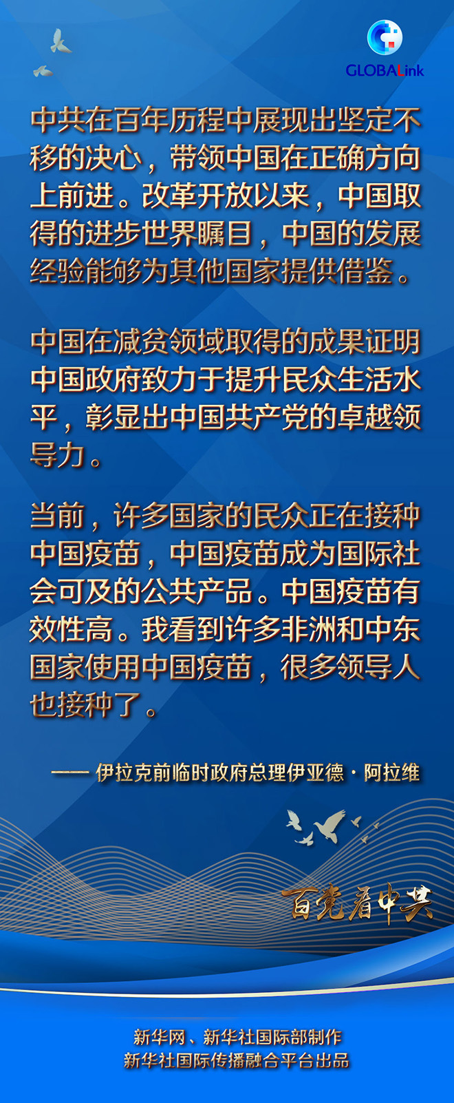 阿拉維對中國共產黨百年華誕表示祝賀。他說,中共在百年歷程中展現出堅定不移的決心,帶領中國在正確方向上前進。改革開放以來,中國取得的進步世界矚目,中國的發展經驗能夠為其他國家提供借鑒。