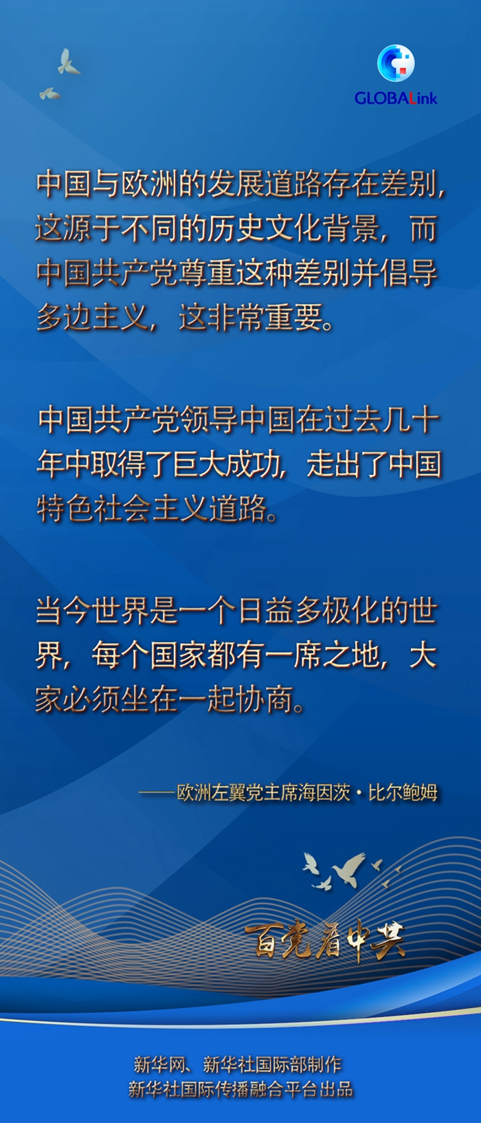 比爾鮑姆說,中國共產黨領導中國在過去幾十年中取得了巨大成功,走出了中國特色社會主義道路。中國擁有深厚的文化積淀,其發展歷程與歐洲有相似之處,也有不同之處?!斑@是必然的,因為我們的文化背景不同?!?/p>